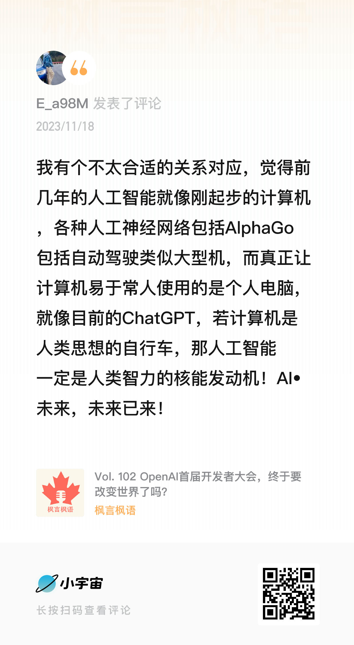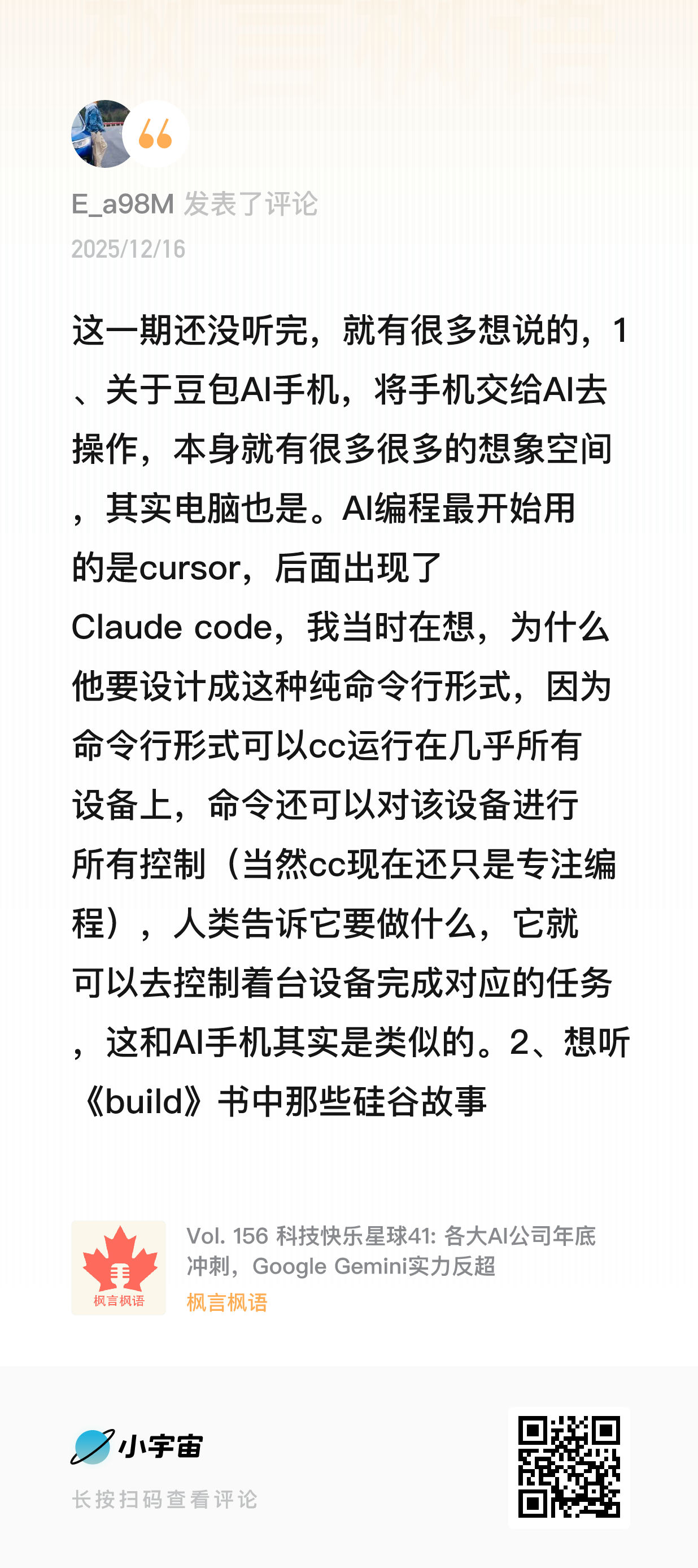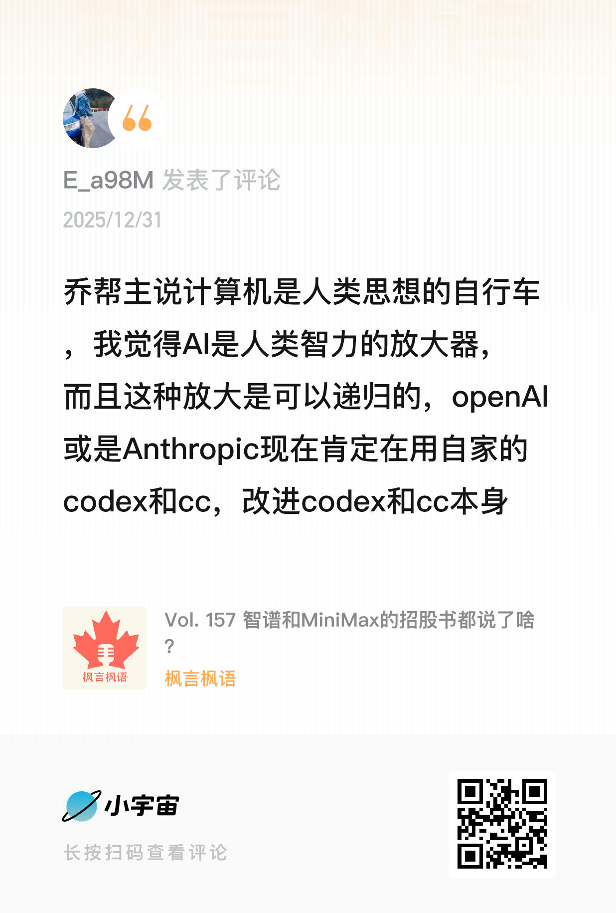 上面的思考更多是对 AI 本质的理解,而下面则是一些在收听播客《枫言枫语》过程中,被进一步激发的零散想法。