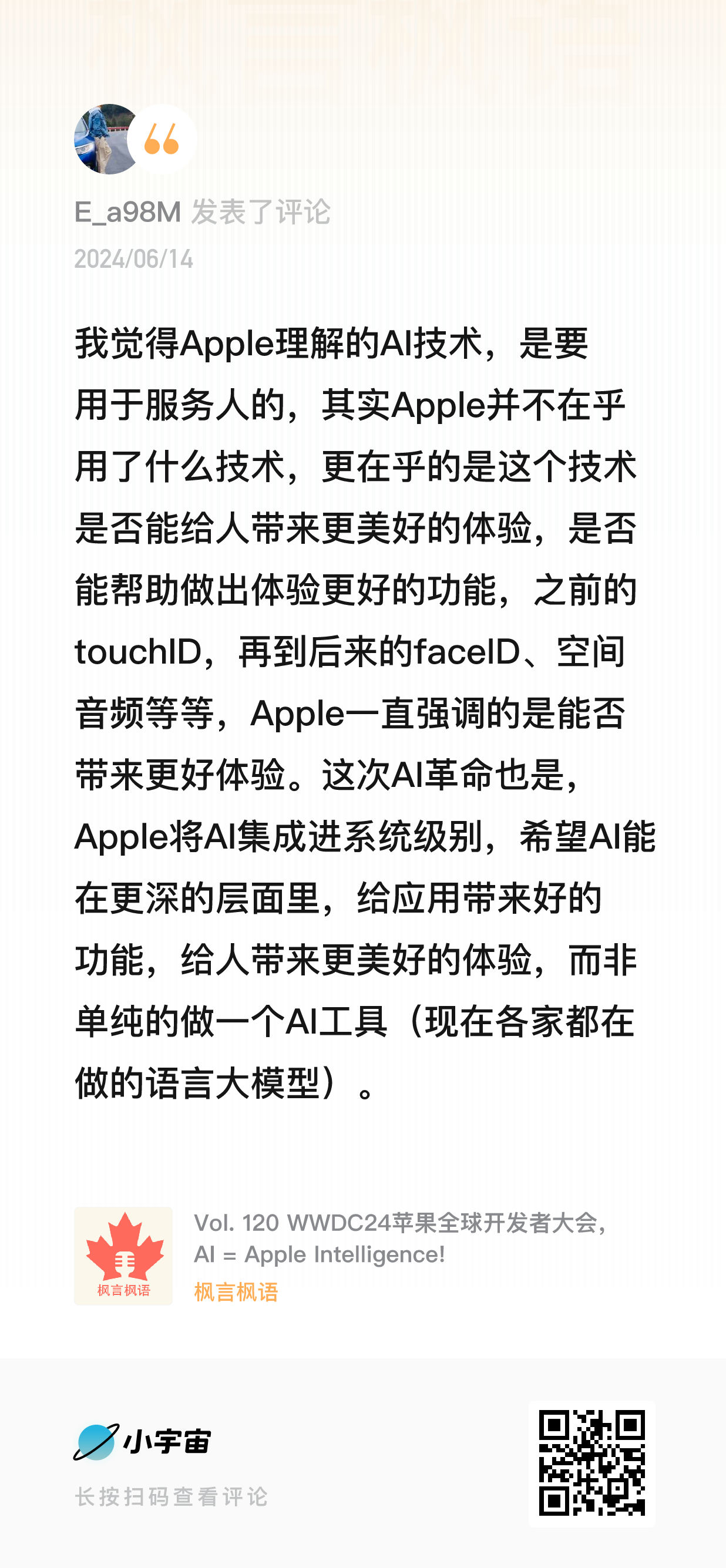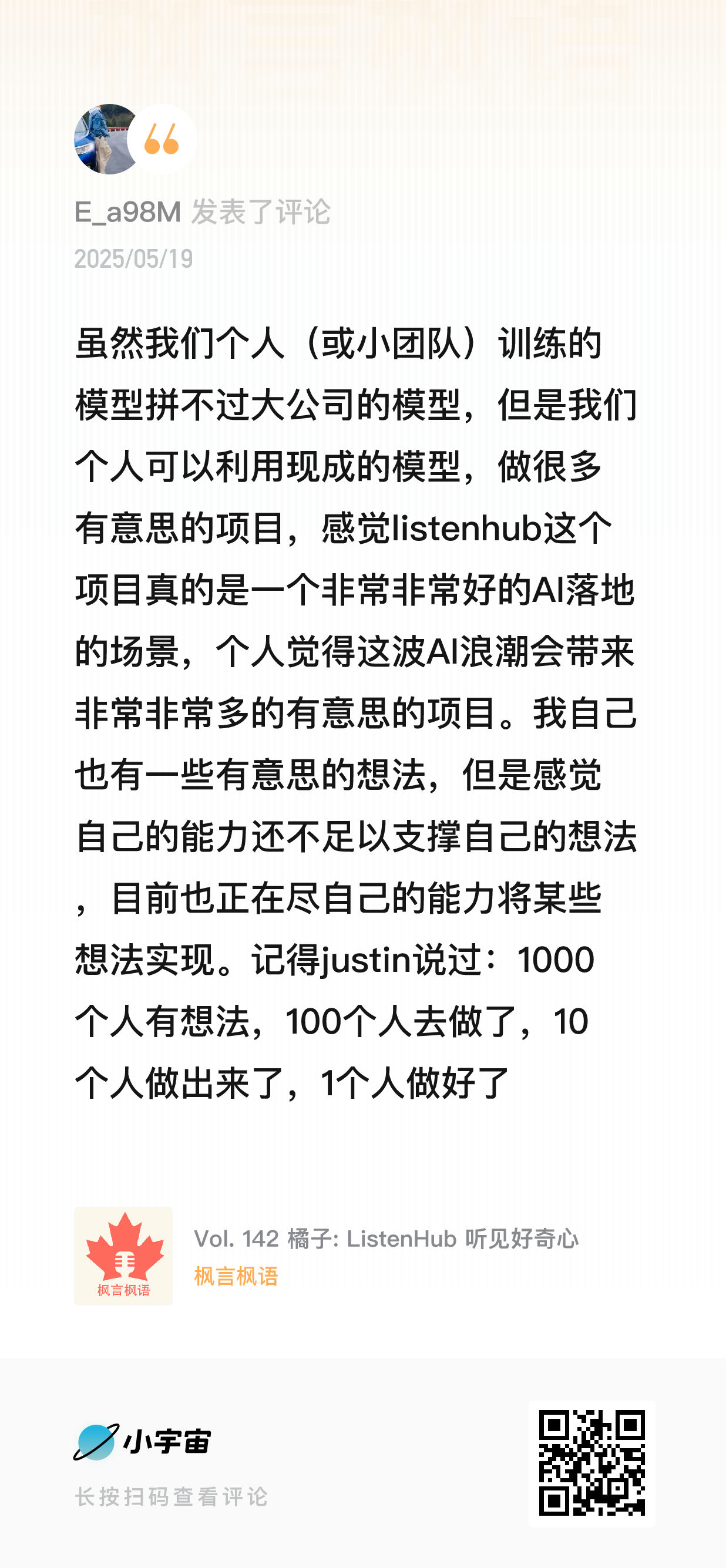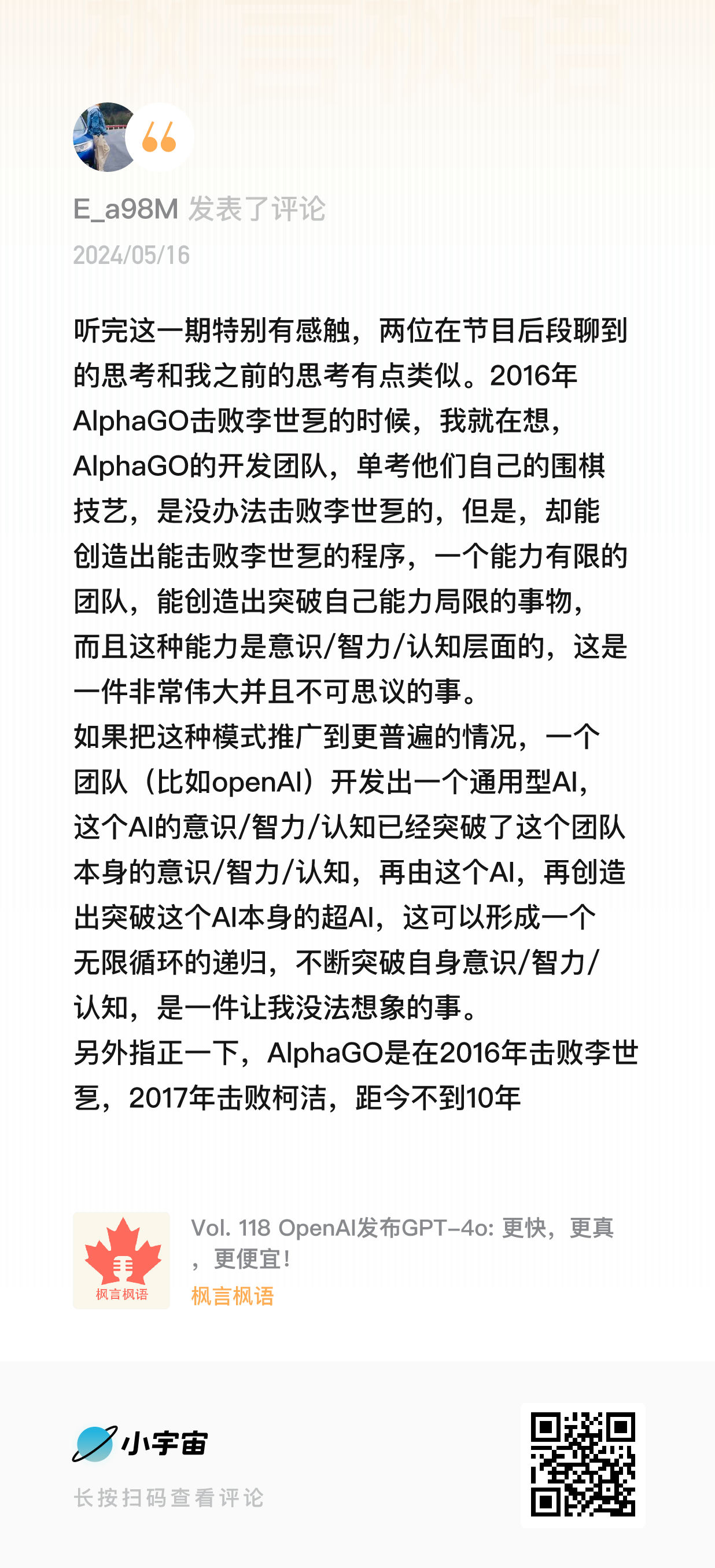上面的思考更多是对 AI 本质的理解,而下面则是一些在收听播客《枫言枫语》过程中,被进一步激发的零散想法。